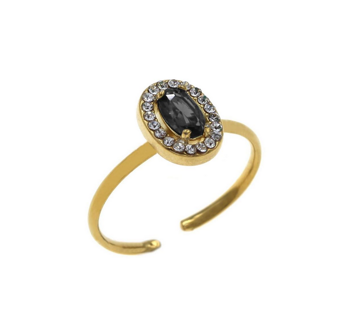 Δαχτυλίδι Ατσάλινο με οβάλ ροζέτα και μαύρη πέτρα. Το δαχτυλίδι εχει ελαφρά αυξομείωση και προσαρμόζεται στο δάχτυλο