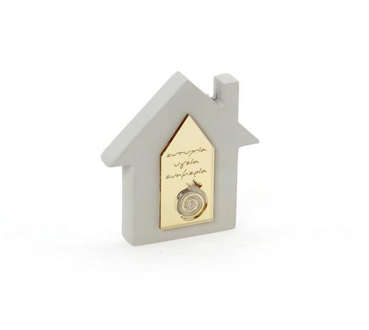 Επιτραπέζιο γούρι σπιτάκι σε γκρι χρώμα και στοιχείο πλέξιγκλας με χαραγμένες ευχές, ιδανικό για δώρο ή για να διακοσμήσετε τον χώρο σας