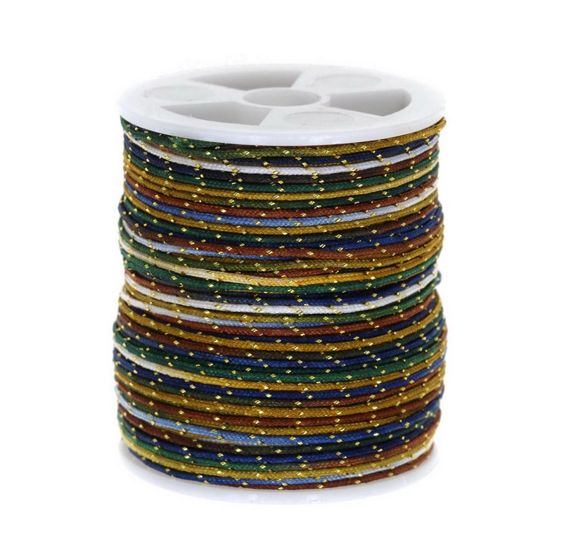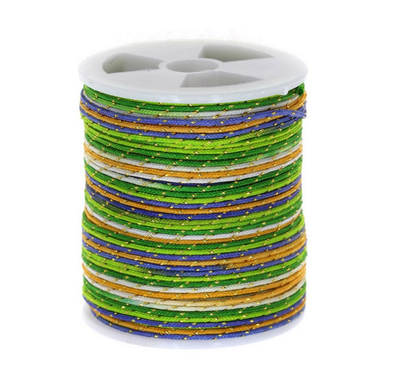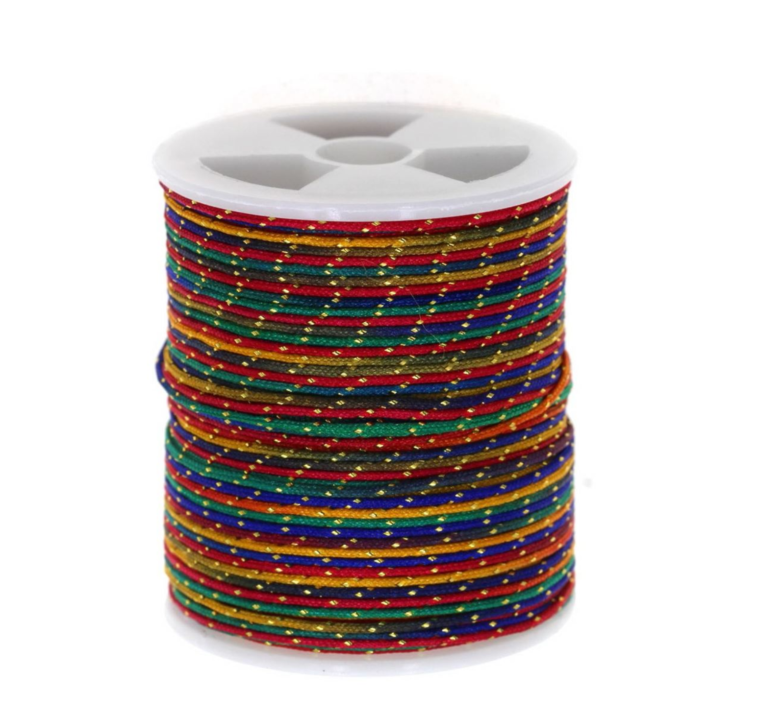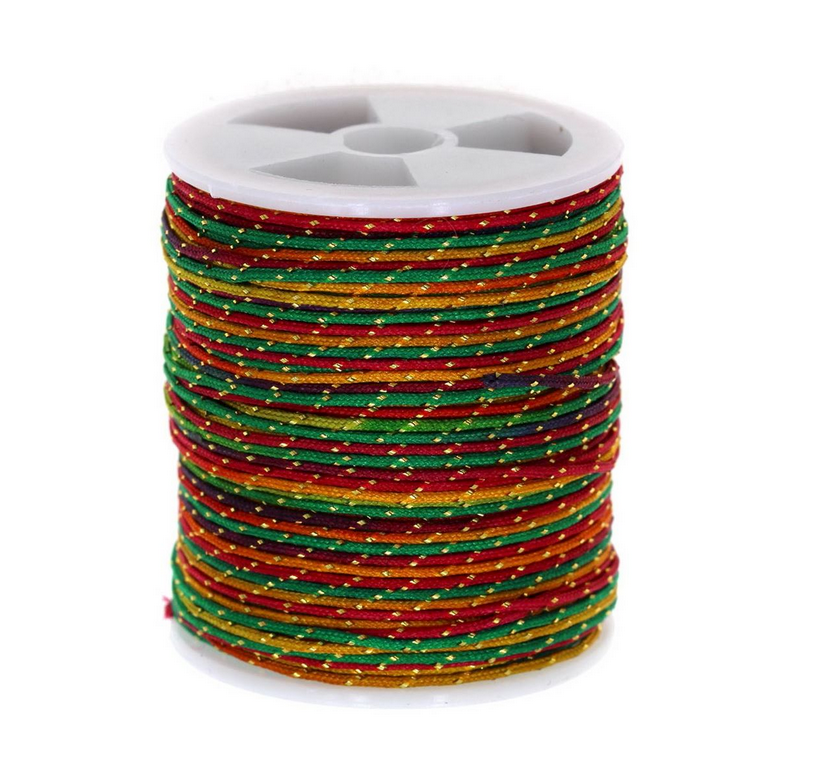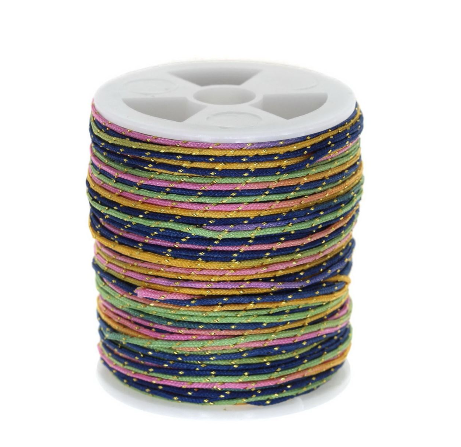 Συνθετικό πολύχρωμο κορδόνι πάχους 0,8μμ ιδανικό για μακραμέ και χειροποίητα κοσμήματα. Καίγεται στην άκρη και έχει πλεγμένη χρυσοκλωστή. Η τιμή αναφέρεται σε μικρό καρουλάκι 15 μέτρων