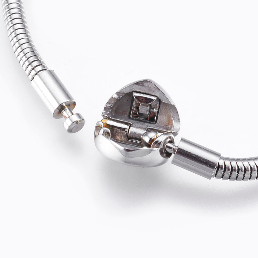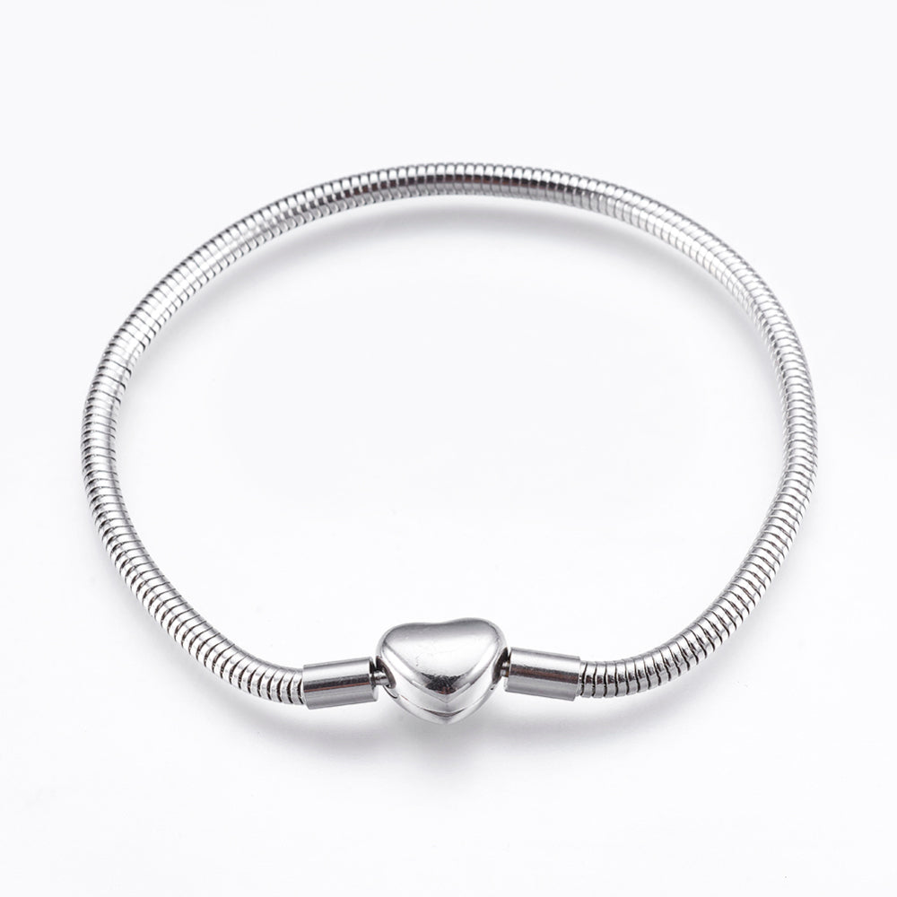 Ασημί ατσάλινο βραχιόλι από ανοξείδωτο ατσάλι με διακοσμητικό κούμπωμα σε σχήμα καρδιάς. Είναι περίπου 20 εκατοστά για να έχει χαλαρή εφαρμογή στον καρπό και μπορεί να στολιστεί με ευρωπαϊκές χάντρες και διακοσμητικά με μεγάλη τρύπα.