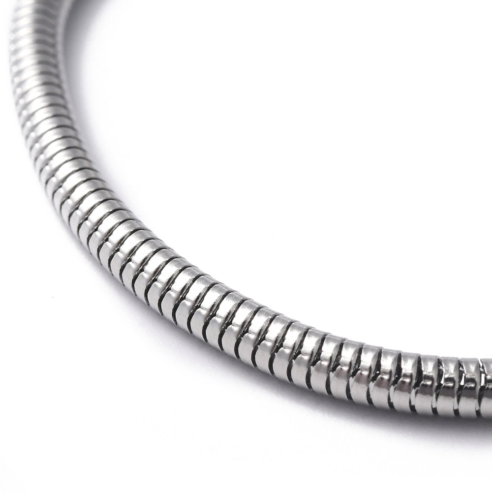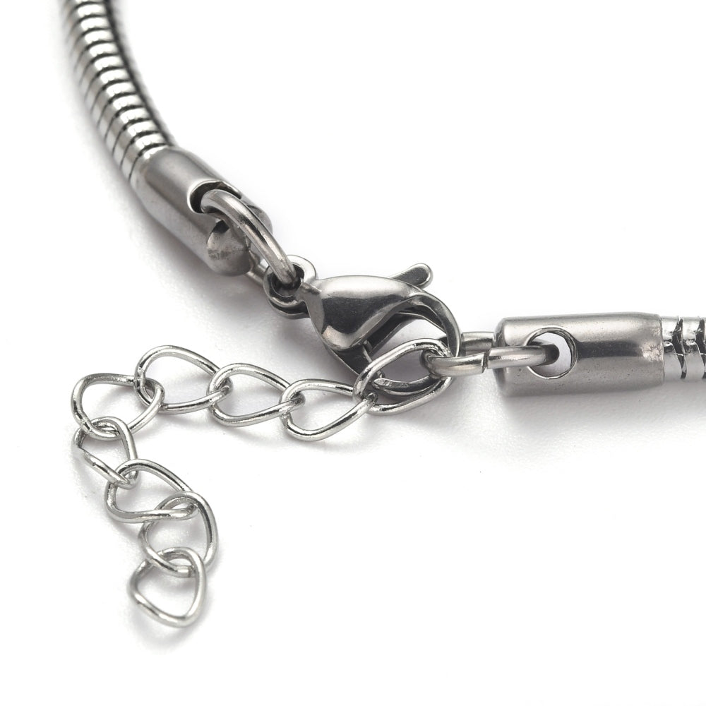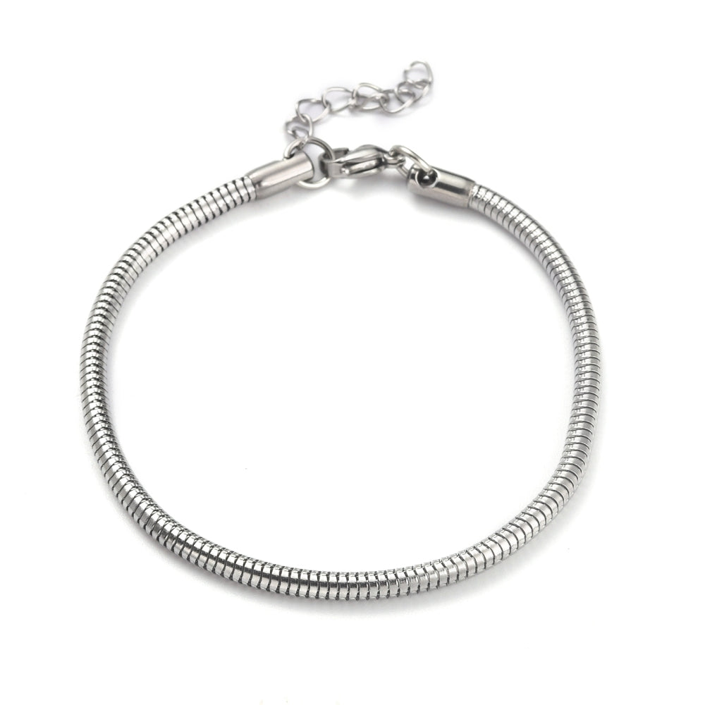 Ασημί ατσάλινο βραχιόλι από ανοξείδωτο ατσάλι που δεν μαυρίζει και πέκταση αλυσίδας. Είναι περίπου 20 εκατοστά με χαλαρή εφαρμογή στον καρπό και μπορεί να στολιστεί με ευρωπαϊκές χάντρες και άλλες χάντρες με μεγάλη τρύπα.