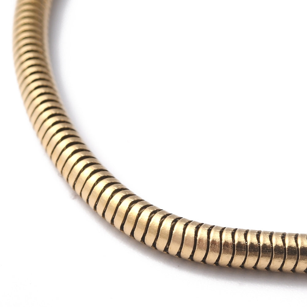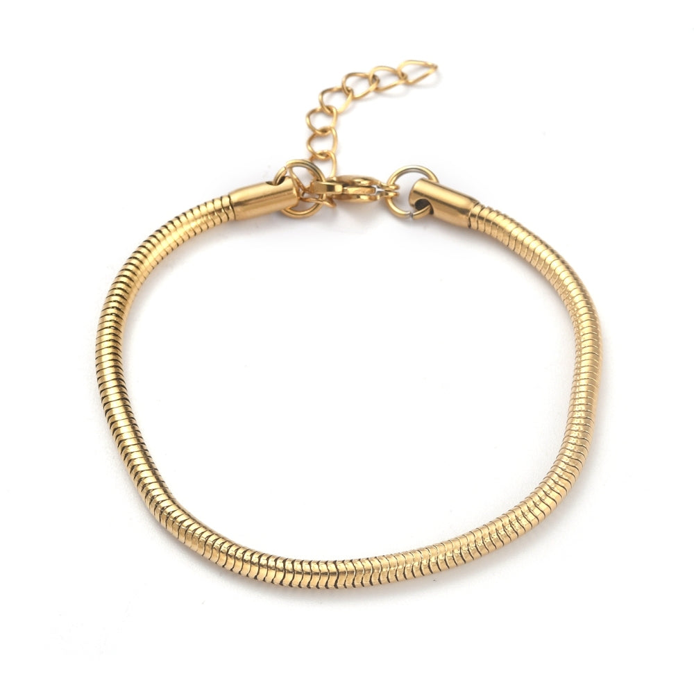 Χρυσό ατσάλινο βραχιόλι από ανοξείδωτο ατσάλι που δεν μαυρίζει και πέκταση αλυσίδας. Είναι περίπου 20 εκατοστά με χαλαρή εφαρμογή στον καρπό και μπορεί να στολιστεί με ευρωπαϊκές χάντρες και άλλες χάντρες με μεγάλη τρύπα.