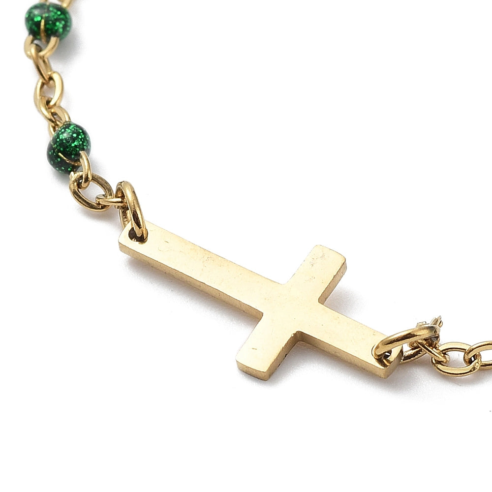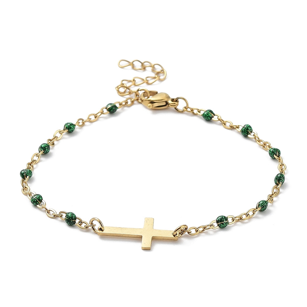 Βραχιόλι από ατσάλι με πράσινο σμάλτο και σταυρό που δεν μαυρίζει και μπορεί να φορεθεί σε όλες σας τις δραστηριότητες σας.