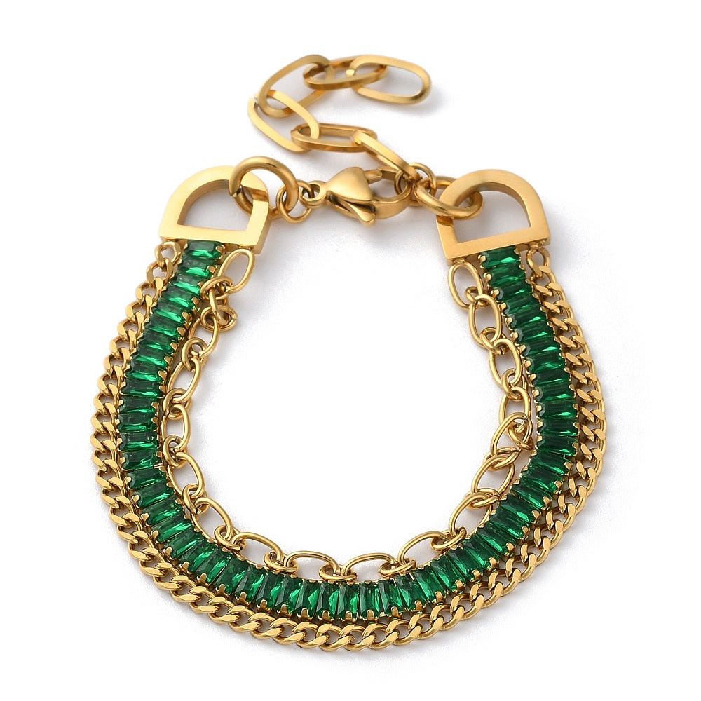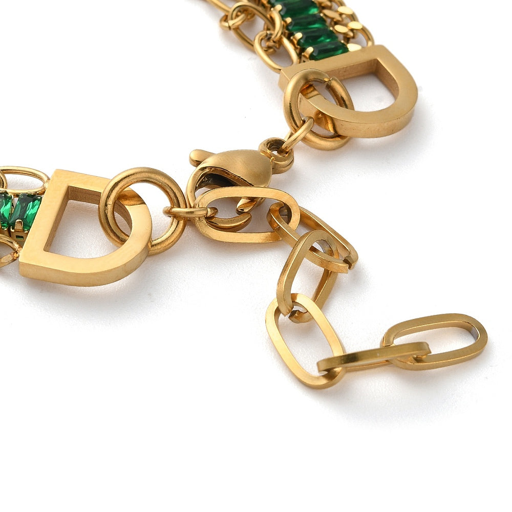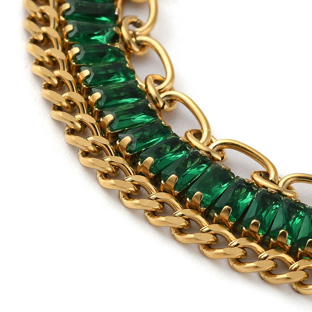 Χρυσό ατσάλινο βραχιόλι από ανοξείδωτο ατσάλι που δεν μαυρίζει και επέκταση αλυσίδας με σμαραγδί στρας. Είναι 17 εκατοστά συν 4 εκατοστά επέκταση για να ταιριάζει σε όλους τους καρπούς