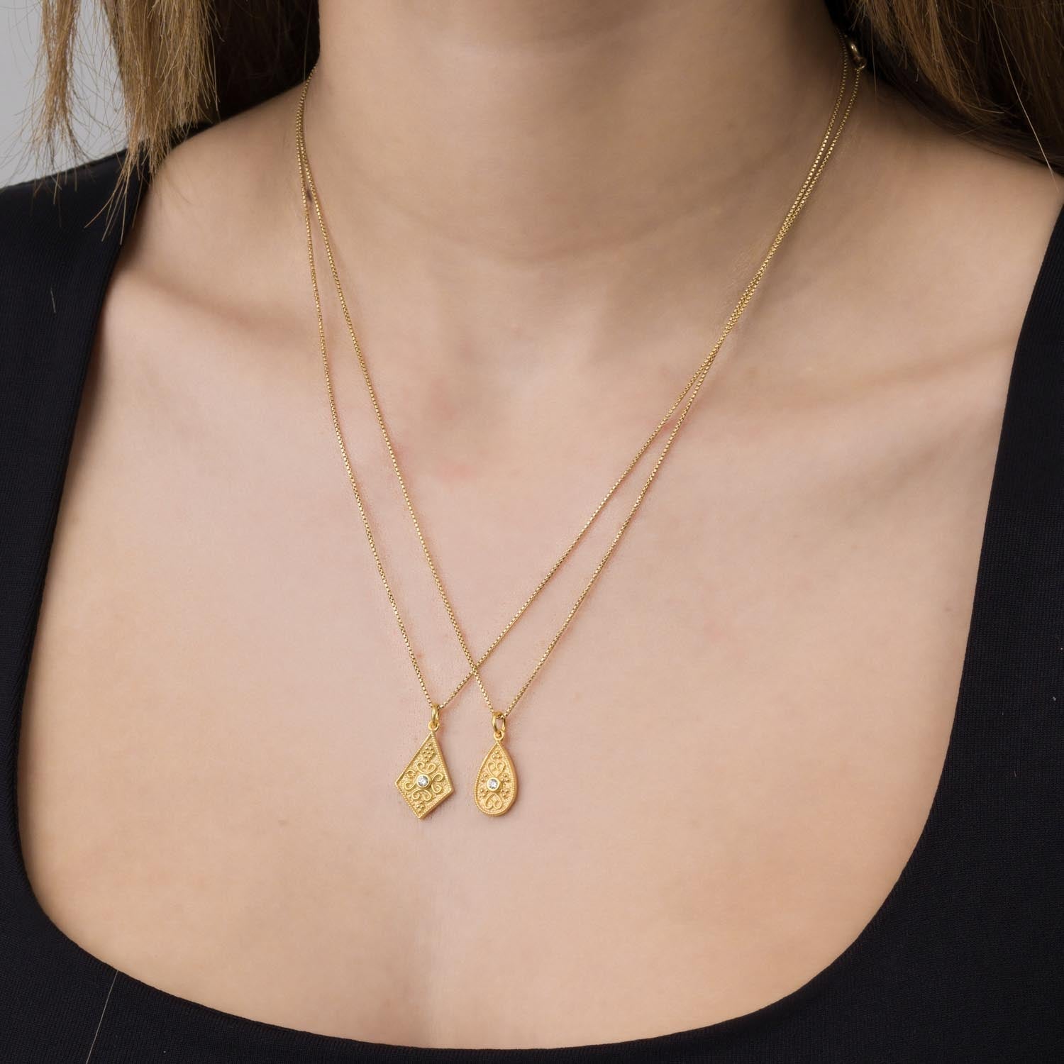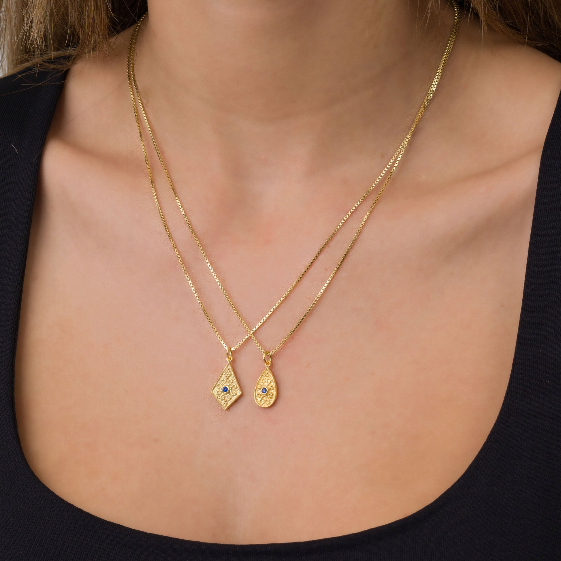 Επίχρυσο κολιέ από ασήμι 925 με ίδια ποιότητα αλυσίδας. Μπορείτε να επιλέξτε ανάμεσα σε δύο σχήματα και τρία χρώματα.