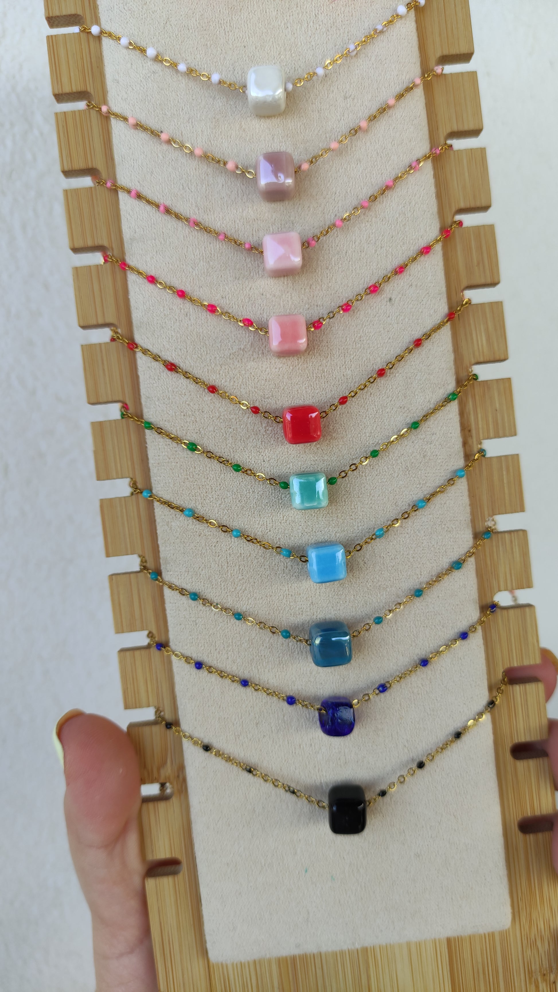 Ένα από τα πιο παιχνιδιάρικα κολιεδάκια που φοριέται μόνο του αλλά μπορεί και να συνδυαστεί και με άλλα κοσμήματα για ένα πανέμορφο layering. Χειροποίητο κολιέ με κεραμικό ματάκι περασμένο σε επίχρυσο ατσάλινο αλυσιδάκι που δεν μαυρίζει και δεν προκαλεί αλλεργίες. Είναι 38 εκατοστά με 7 εκατοστά επέκταση αλυσίδας ώστε να αυξομειώνετε το μάκρος του.