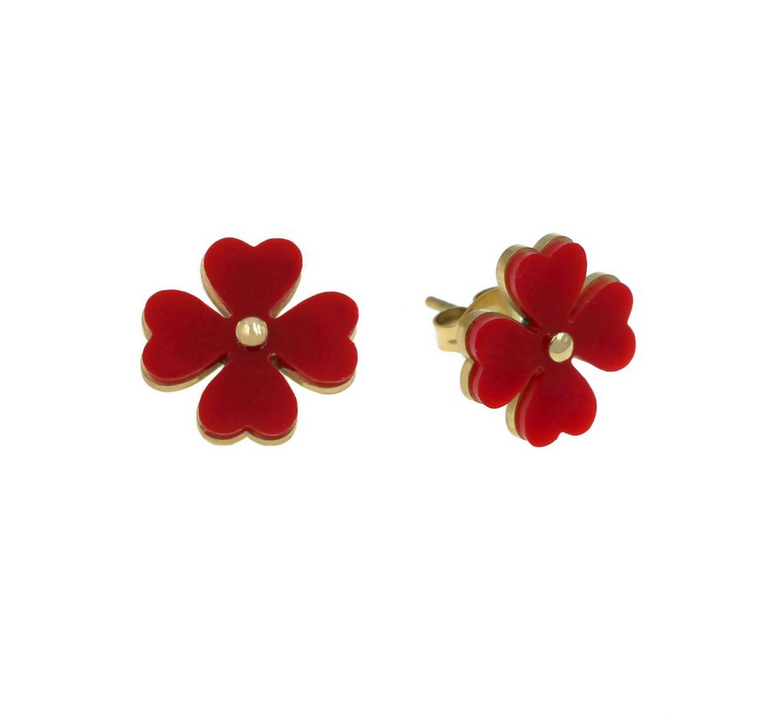 Εντυπωσιακά ατσάλινα κόκκινα σκουλαρίκια σε σχήμα τετράφυλλου τριφυλλιού, από ανοξείδωτο ατσάλι που δε θα χάσουν το χρώμα τους ακόμα και μετά από έκθεση σε νερό ή άρωμα.