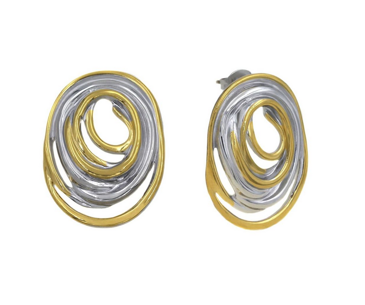 Εντυπωσιακά δίχρωμα σκουλαρίκια σε γεωμετρικό σχήμα με κύκλους, από ανοξείδωτο ατσάλι που δε θα χάσει το χρώμα του ακόμα και μετά από έκθεση σε νερό ή άρωμα.