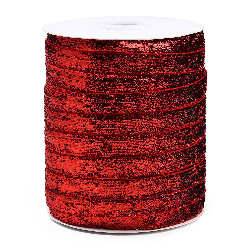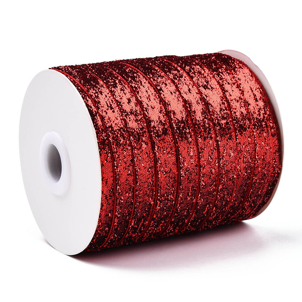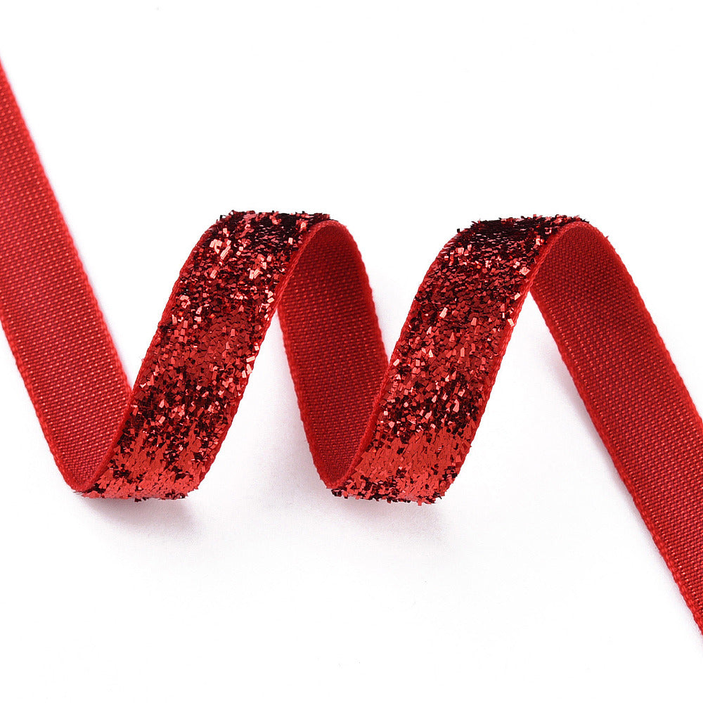 Συνθετική κορδέλα 10mm με γκλίττερ, εξαιρετική επιλογή για χειροποίητες κατασκευές και DIY διακόσμηση. Το χρώμα είναι κόκκινο βαθύ με γκλίττερ.